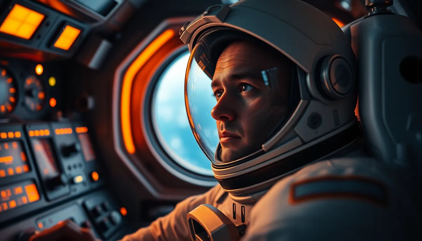 This intimate image portrays an astronaut seated inside a spacecraft cockpit, surrounded by the warm glow of control panels against the cold metallic walls. The astronaut's thoughtful expression is sharply focused, revealing a blend of human emotion amidst advanced technology. The shallow depth of field creates a dreamlike background, and the warm oranges mixed with cool greys evoke a complex mood. The composition effectively frames the astronaut against the window, inviting viewers to consider the vastness of space beyond.