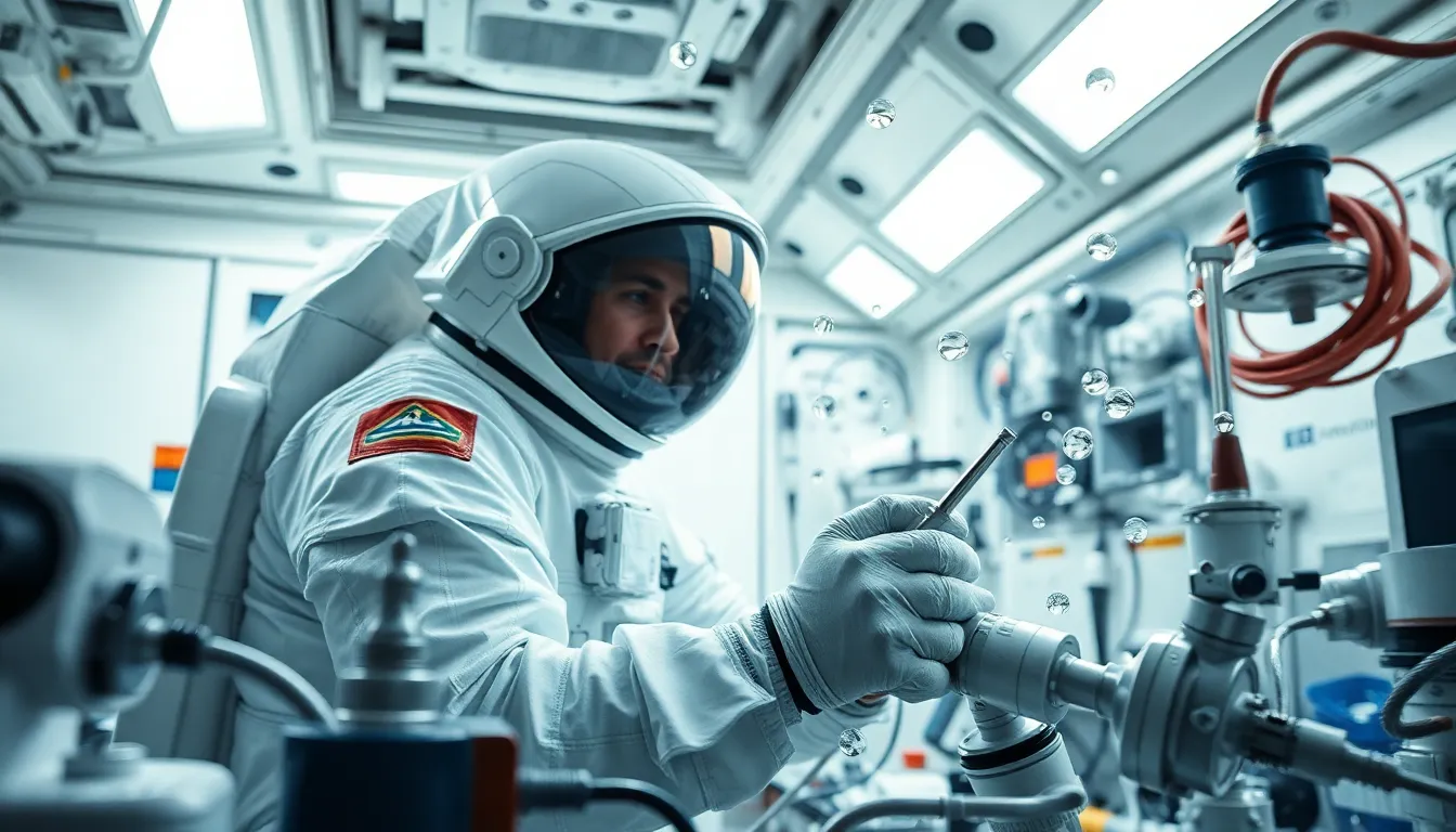 This captivating image shows an astronaut actively engaged in scientific experiments aboard a space station. The bright LED lighting creates a clean and sterile atmosphere, while the floating tools and instruments add a dynamic quality. The cool color palette enhances the futuristic feel of the scene, bringing focus to the astronaut's intricate suit. The overall composition illustrates the blend of technology and human ingenuity in the realm of space exploration.