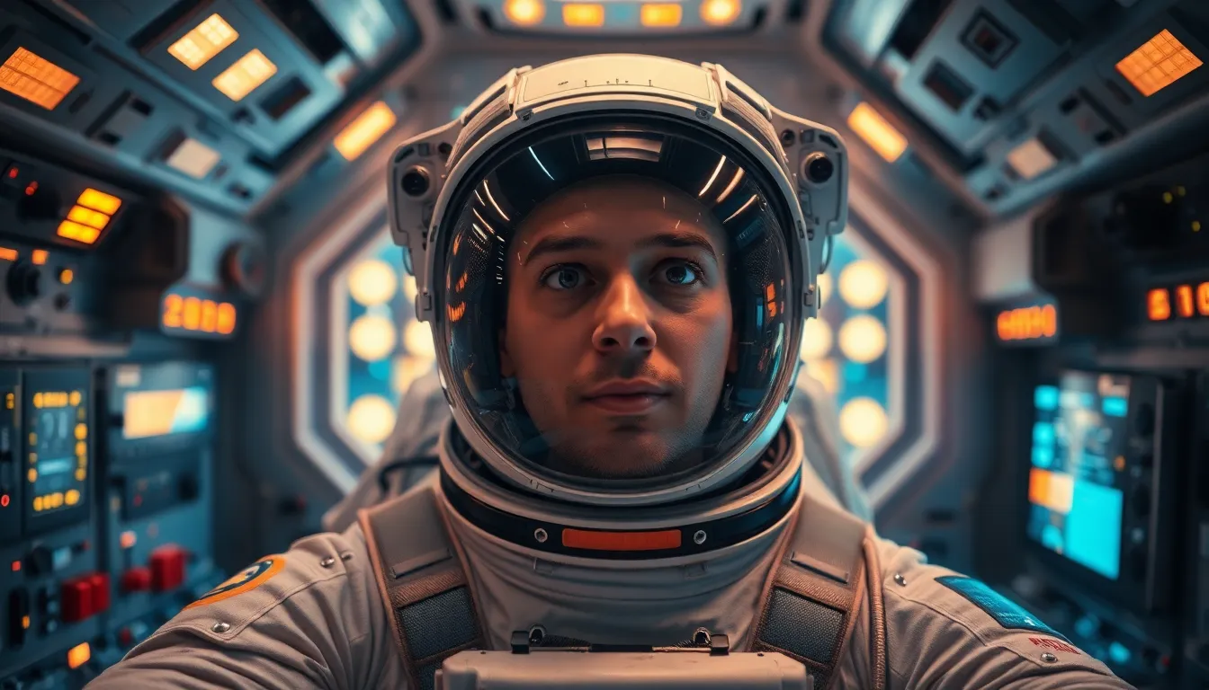 This intimate image features an astronaut engrossed in their work within a spacecraft cabin. Warm practical lighting enhances the high-tech environment, creating an engaging atmosphere. The astronaut's focused expression and detailed suit draw the viewer in, inviting them into the world of space exploration. The blurred background of control panels adds depth, emphasizing the astronaut's role in navigating the mysteries of space.