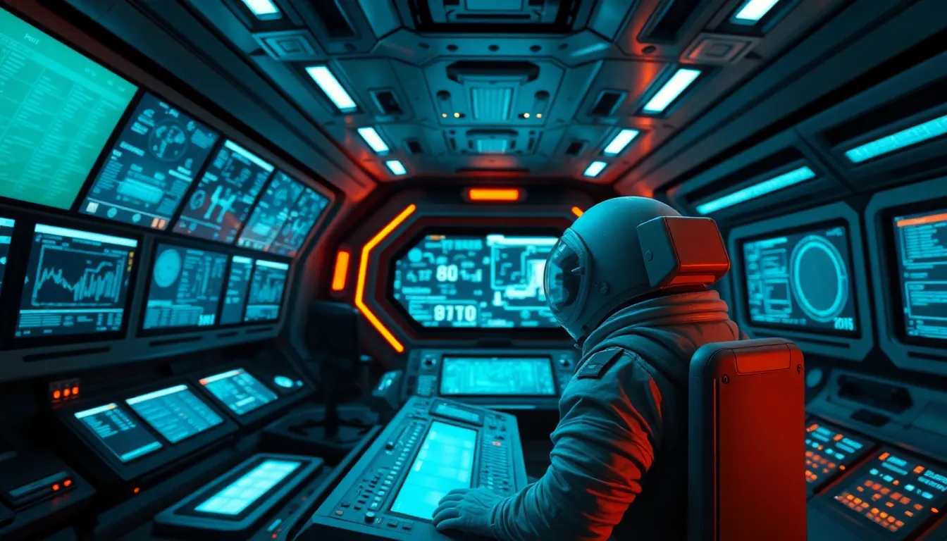 An astronaut operates advanced controls in a sleek, futuristic spacecraft, surrounded by glowing screens and intricate equipment. The cool blue lighting adds a modern, high-tech feel, while the astronaut's intense focus captures the excitement of space missions. This image illustrates the blend of human endeavor and cutting-edge technology in the depths of space, inviting viewers into an extraordinary environment.