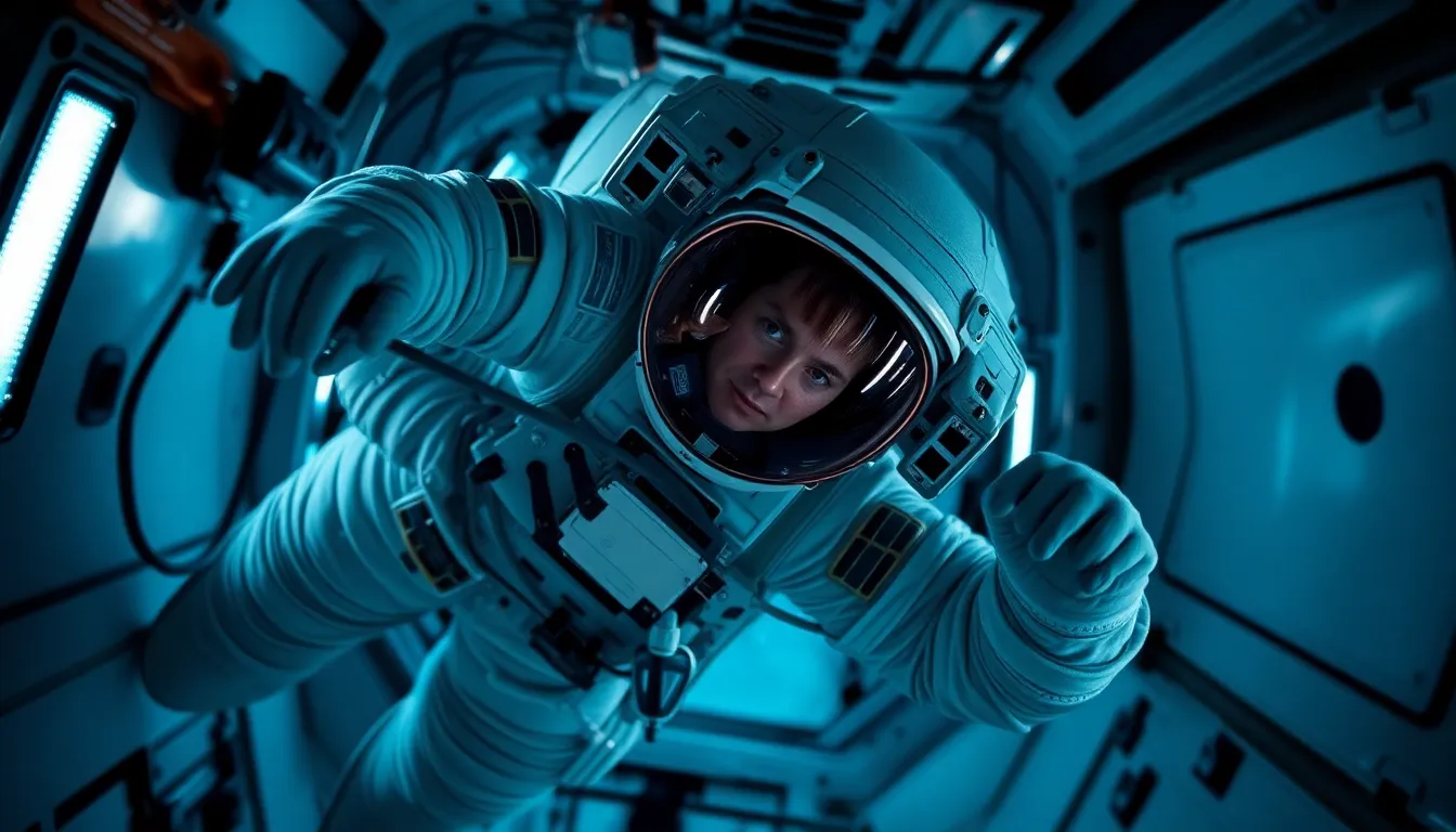This dynamic image portrays an astronaut floating in zero gravity inside a spacecraft, diligently performing a repair. Illuminated by the bluish interior lights, the scene captures the clinical feel of space technology. A shallow depth of field emphasizes the astronaut, while their tools remain slightly blurred, enhancing the focus. The metallic textures of the spacecraft and fabric of the suit provide a striking contrast, creating a vivid representation of life in space.