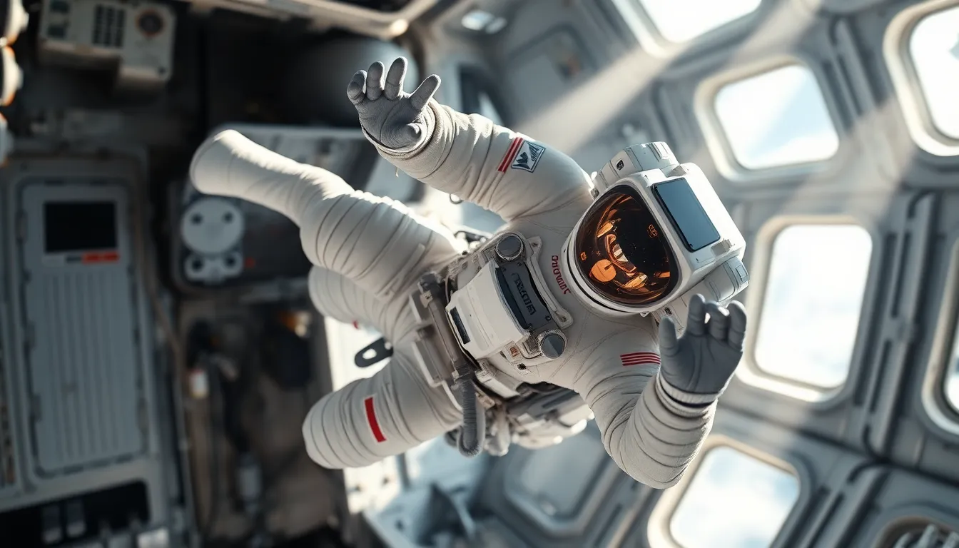 A captivating image of an astronaut floating in the International Space Station, captured in vibrant detail. The bright daylight filters through large windows, illuminating the scene and enhancing the textures of the astronaut's suit. The cool color palette emphasizes the high-tech environment filled with equipment and floating objects. The dynamic composition draws the viewer's attention to the astronaut's focused expression, evoking a sense of exploration and wonder in the vastness of space.