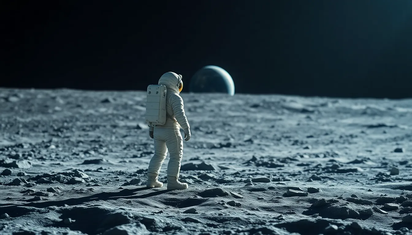 This breathtaking image showcases an astronaut standing on the grey expanse of the lunar surface, gazing at Earth suspended in the dark sky. The serene mood is amplified by the soft light and shallow focus, drawing attention to the astrobiological suit details and the stark lunar landscape. The contrast between the vibrant blue of Earth and the muted tones of the moon adds a captivating visual element, symbolizing human exploration and wonder.