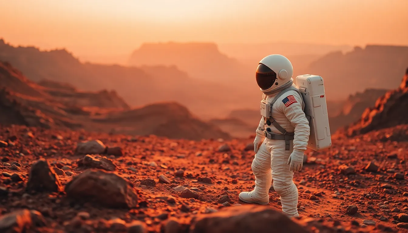 This captivating image depicts an astronaut exploring the rocky surface of Mars during sunset. The warm oranges and reds of the Martian landscape create a stunning backdrop for the astronaut's white suit, creating a vivid contrast. Positioned in the foreground, the astronaut's presence against the vast canyon of Valles Marineris highlights the scale and enormity of this alien world.