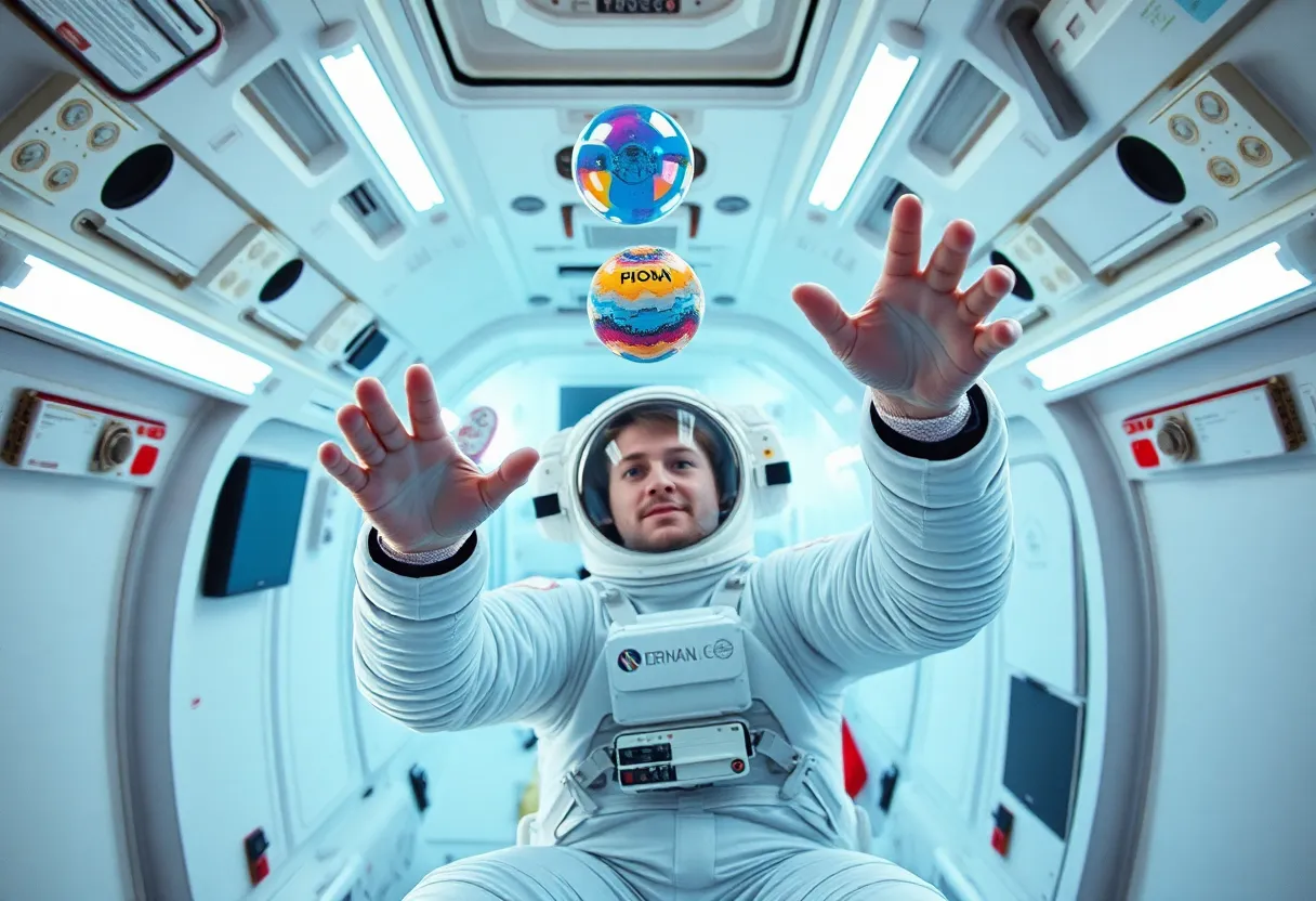 This whimsical image shows an astronaut engaging playfully with a floating orb in a zero-gravity environment. Brightly lit by practical LED lights, the scene captures a joyful atmosphere. The vibrant color palette brings life to the image, contrasting the astronaut's suit with the orb. The dynamic angle and shallow depth of field allow for a sense of movement and fun that highlights the wonder of space travel.