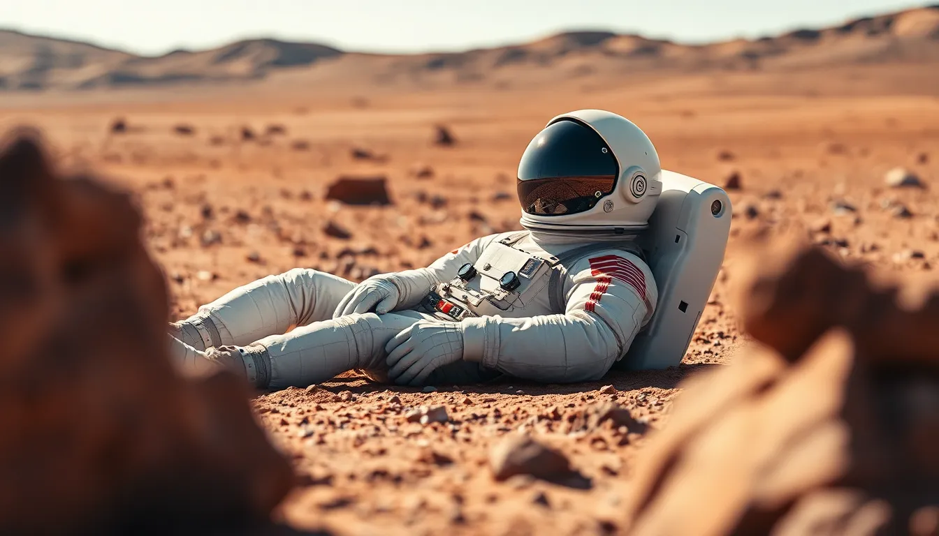 This serene image captures an astronaut taking a moment to relax on the Martian surface. Soft, diffused daylight bathes the scene, highlighting the intricate textures of the ground and the astronaut's suit. The warm red and brown hues enhance the otherworldly atmosphere, drawing the viewer into the harsh yet beautiful landscape of Mars. The composition invites a sense of tranquility, showcasing the human experience in an alien environment.