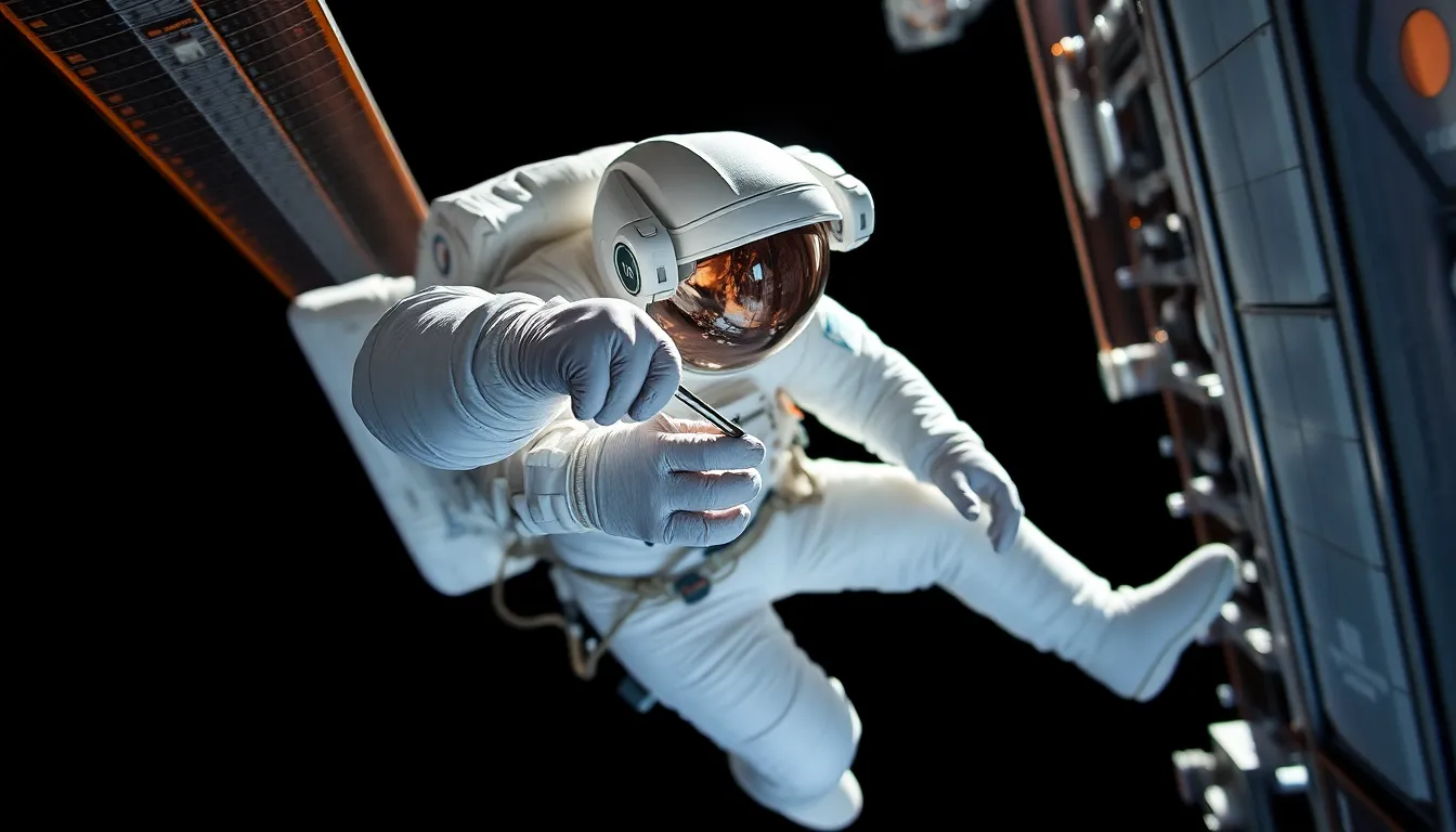 In this dynamic image, an astronaut is captured during a spacewalk, repairing the exterior of the International Space Station. The bright white of their suit contrasts brilliantly with the dark vastness of space, illuminated by sharp sunlight that accentuates the details of their tools and the ISS structure. The shallow depth of field brings attention to the precision of the astronaut's actions while providing a sense of the immense scale of the station. This scene encapsulates the critical work being done in low-Earth orbit.