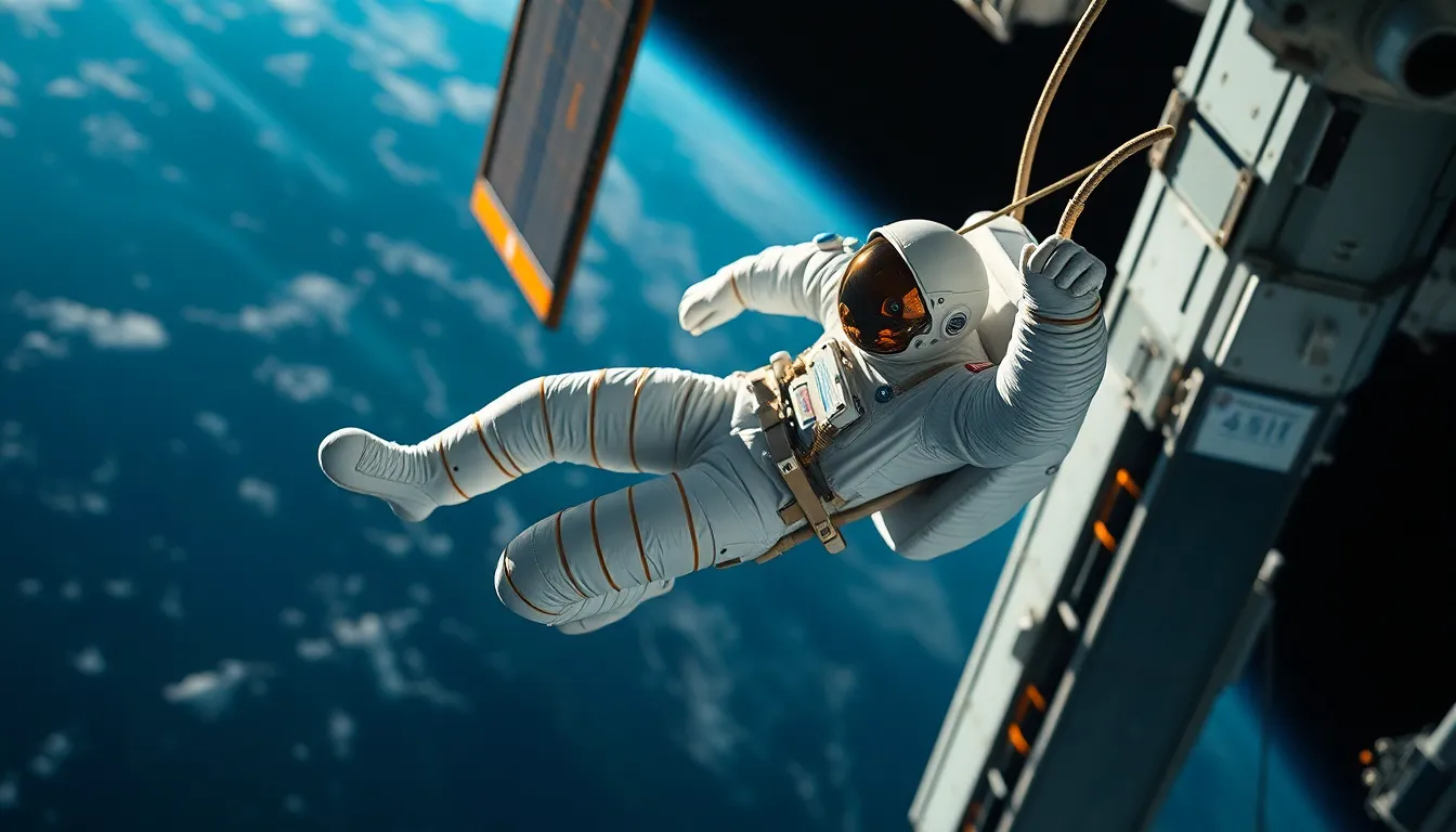 This image captures a striking scene of an astronaut conducting a spacewalk near the International Space Station. Natural sunlight highlights the details of the astronaut's suit against the dark void of space, showcasing the stunning colors of Earth below. The dynamic composition emphasizes the vastness of their environment, creating a sense of awe and adventure. The cinematic color grading enhances the overall mood, making it a captivating visual representation of human exploration in space.