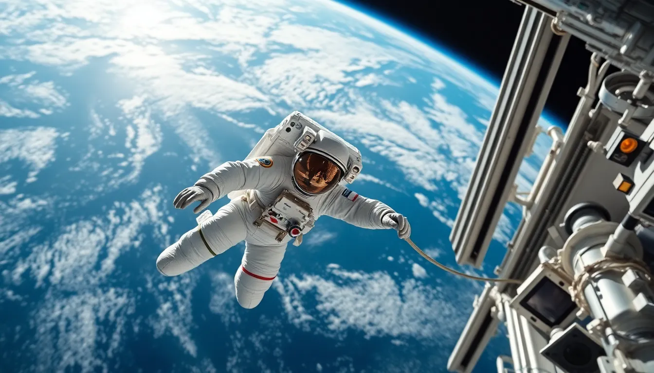 This image captures an astronaut in a spacewalk, tethered to the International Space Station against the breathtaking backdrop of Earth. The sunlight glints off the metallic surfaces, creating a high-tech ambiance. The blues of the oceans and whites of the clouds contrast strikingly with the black void of space, emphasizing the astronaut's isolation in the vastness. The composition draws the eye towards the figure while the blurred Earth creates a sense of depth and altitude.
