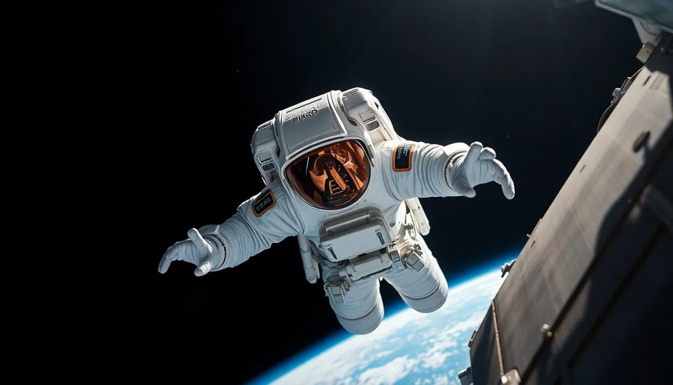 This stunning image portrays an astronaut performing a spacewalk, perfectly framed against the infinite blackness of space. The astronaut’s white suit sharply contrasts with the vibrant blues of Earth visible below, showcasing the unique environment of low Earth orbit. The intense sunlight highlights textures on the space suit, emphasizing intricate details and equipment used during the mission. The overall composition draws the viewer’s eye through the tether connection, creating a sense of isolation and adventure in the vastness of the cosmos.