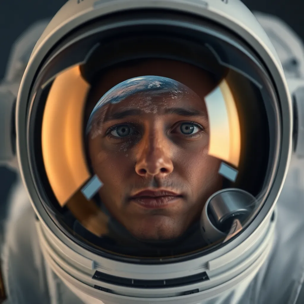 A stunning close-up view of an astronaut's helmet visor, capturing the reflection of Earth as seen from space. The soft studio lighting enhances the intricate details of the helmet while revealing hints of the astronaut's face inside. This captivating image evokes feelings of connection and nostalgia, reminding viewers of the home planet from the depths of space. The creamy highlights and textured surfaces depict a hyper-realistic representation, drawing the eye to the beauty of both the technology and the Earth.