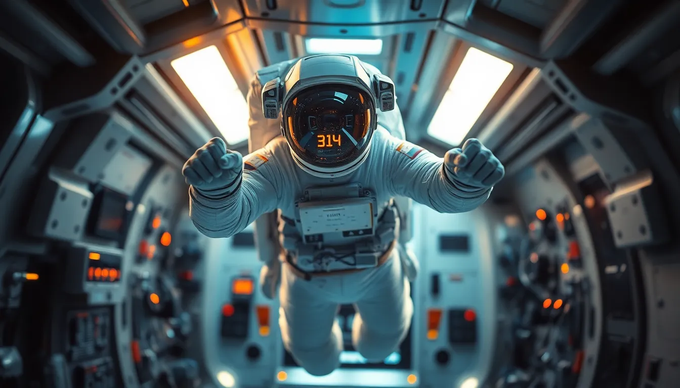 This striking image captures a futuristic astronaut floating effortlessly within a zero-gravity spacecraft. The warm LED lighting casts dramatic shadows, enhancing the sleek design of the spacesuit and the polished interior surfaces. The cool blue and silver color palette contrasts beautifully with the vibrant orange accents of the spacecraft's controls. The use of shallow depth of field draws attention to the astronaut, immersing viewers in the high-tech environment.