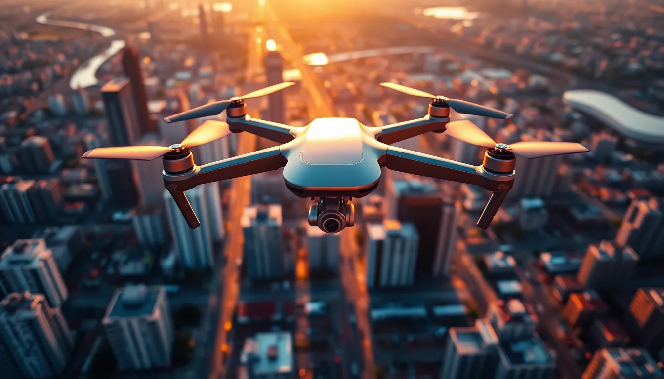 In a stunning aerial view, a sleek delivery drone glides gracefully above a bustling city during golden hour. The warm light creates an enchanting glow on the drone's surface, contrasting with the cool tones of the urban landscape. The intricate details of the city become visible as the drone navigates, highlighting the advanced technology at play in modern urban life. The overall atmosphere is dynamic and futuristic, showcasing the integration of robotics into everyday society.