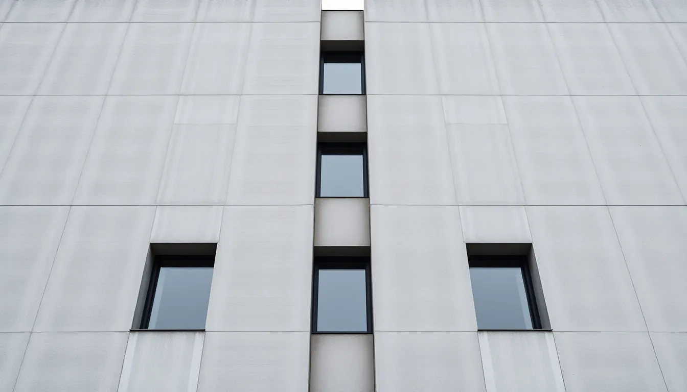 This image showcases a minimalist architectural approach with a focus on a raw concrete facade. The soft overcast lighting emphasizes the smooth textures and uniformity of the material. The grayscale palette enhances the modern aesthetic, making it perfect for architectural design discussions. The symmetric composition draws the viewer's eye towards the structure's simplicity, inviting contemplation of form and function.
