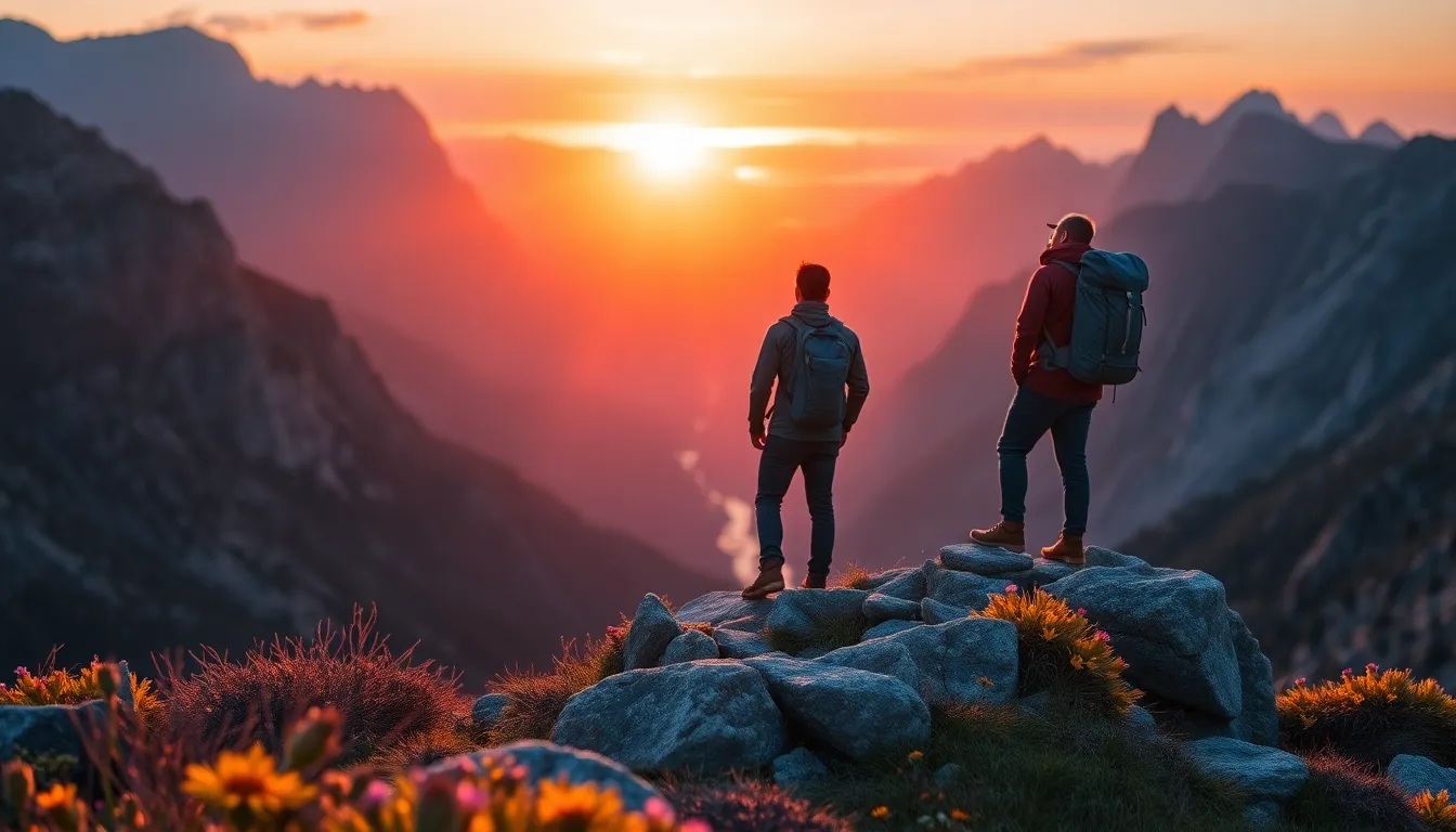 Backpacker at Sunrise on Mountain Cliff