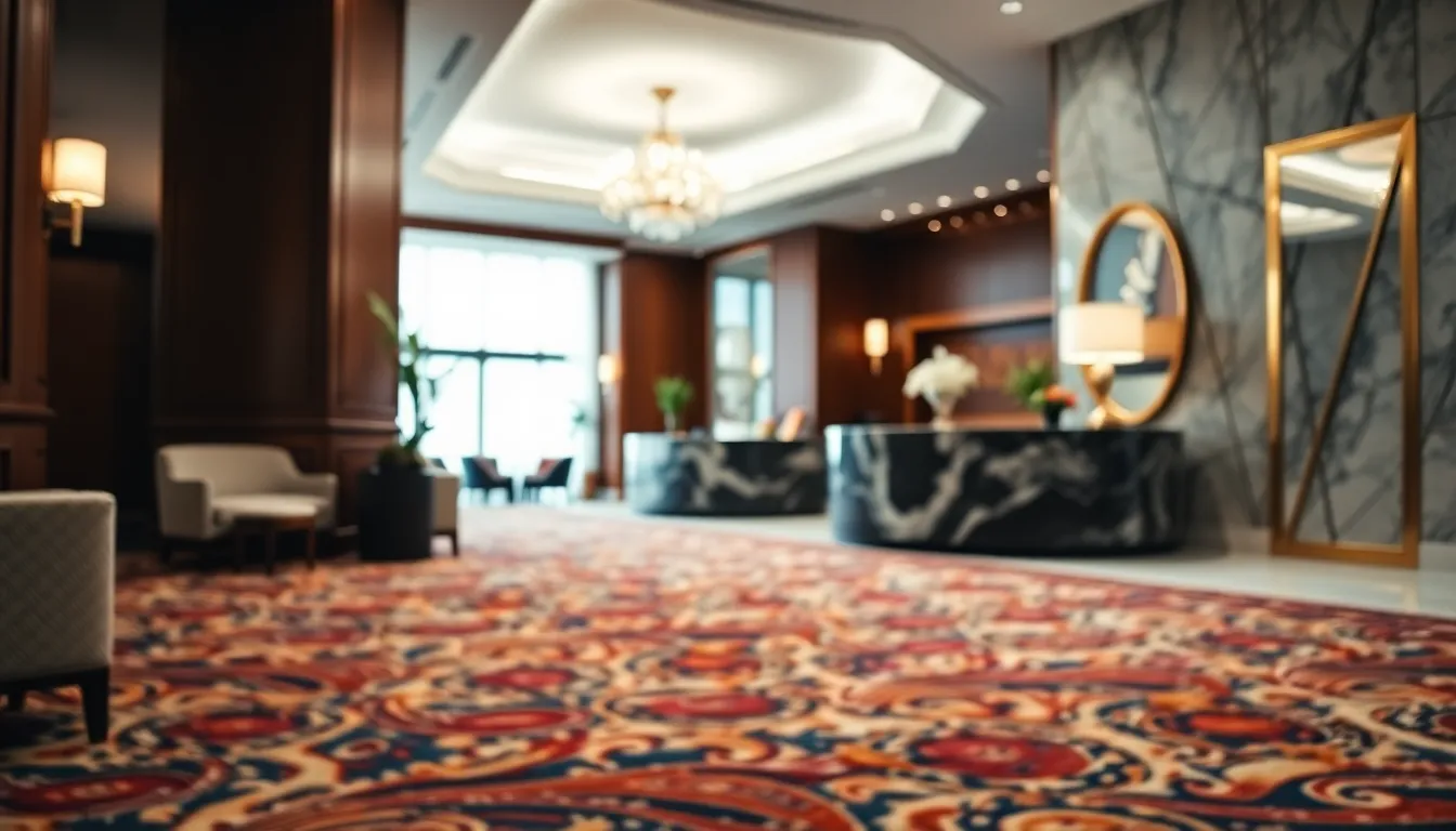 This image captures the essence of an elegant hotel lobby, rich in texture and warm tones. The soft overhead lighting highlights the luxurious details, from the patterned carpet to the polished marble desk. The depth of field allows for a beautiful focus on the intricate elements, while the gently blurred background presents a welcoming ambiance. This scene is perfect for illustrating upscale hospitality environments.