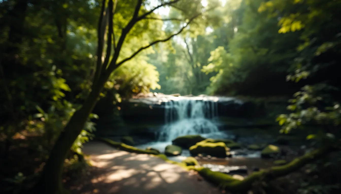 This breathtaking image features a serene waterfall nestled within a lush forest, where dappled sunlight filters through the tree canopy, creating enchanting bokeh highlights. The gentle cascade of water over moss-covered rocks invites tranquility, while the leading lines of the path draw the viewer's eye deeper into the verdant landscape. Muted earth tones enhance the peaceful atmosphere, making it a perfect escape into nature.