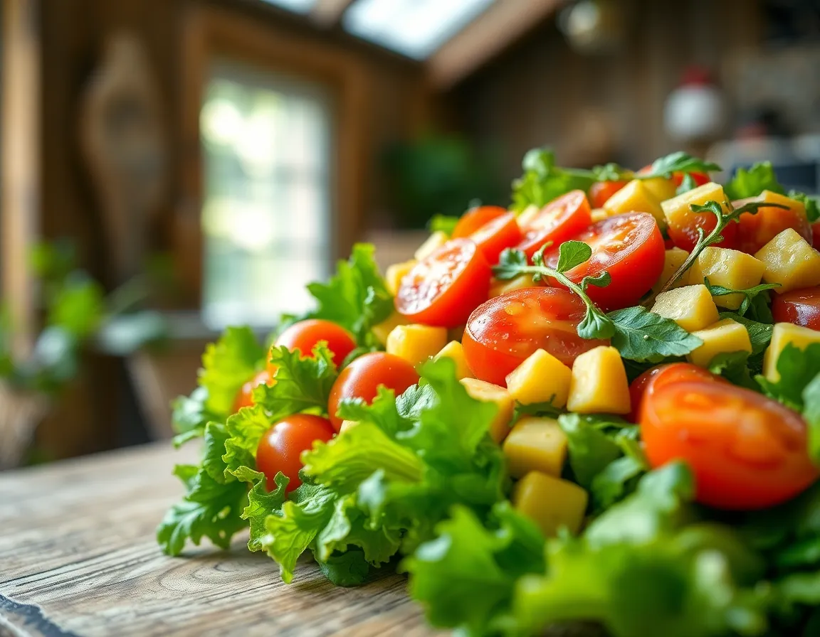This appetizing close-up captures a vibrant summer salad brimming with fresh vegetables and herbs, beautifully displayed on a rustic wooden table. Enhanced natural light brings out the vivid colors and textures of the ingredients, making the salad look incredibly fresh and inviting. The macro shot technique highlights intricate details like water droplets on crisp leaves, perfect for food-related content or summer dining inspiration.